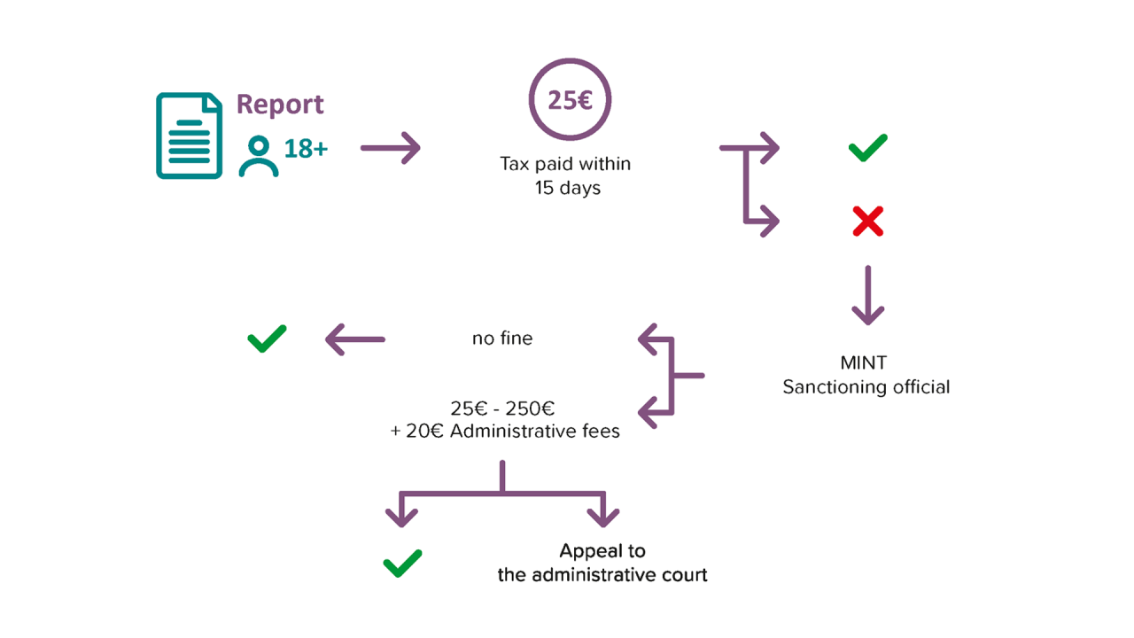 Once the municipal agent has noticed an infringement, the person is asked to pay a tax of 25€ within 15 days in order to avoid the administrative procedure that may lead to a potentially higher fine and administrative fee. If the concerned person does not pay the tax, the sanctioning official of the Ministry of Home Affairs will be asked to review the file. The latter will then decide whether a fine is imposed and will fix the amount based on the general police regulations of the concerned municipality. The sanctioned person may appeal to the administrative court in order to dispute the administrative fine.